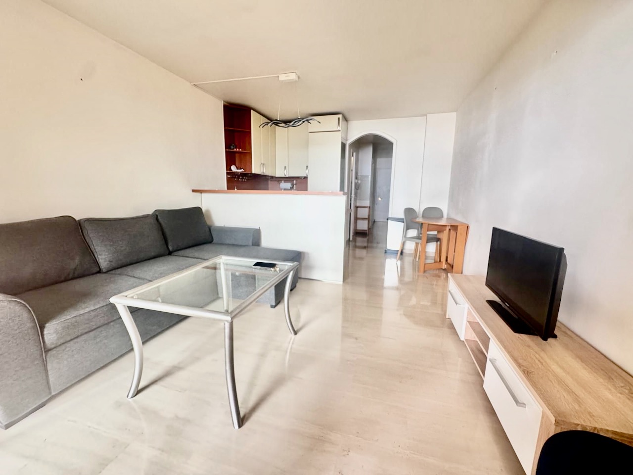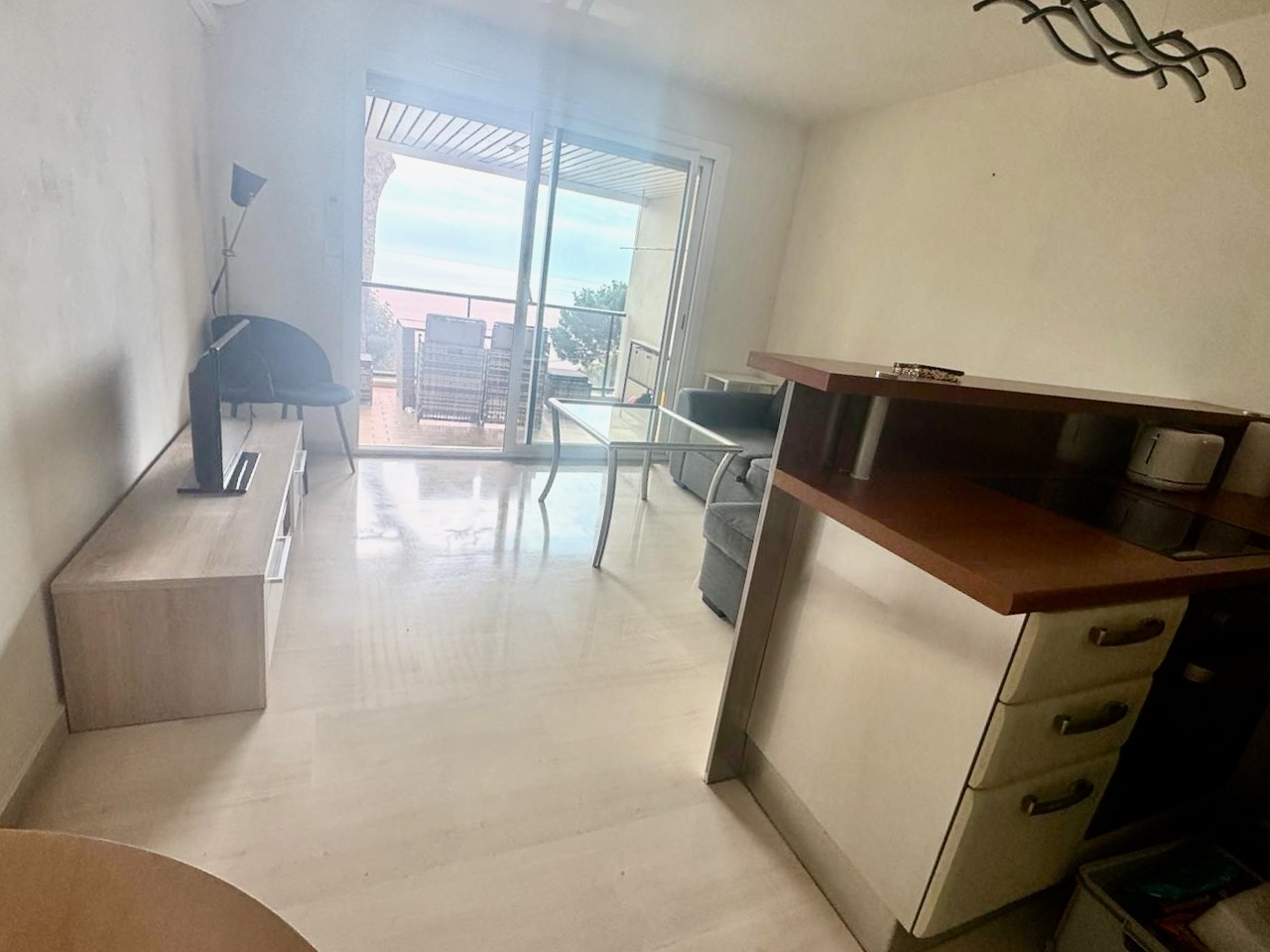 • Bright living room with sofa, TV, coffee table, and direct access to the terrace